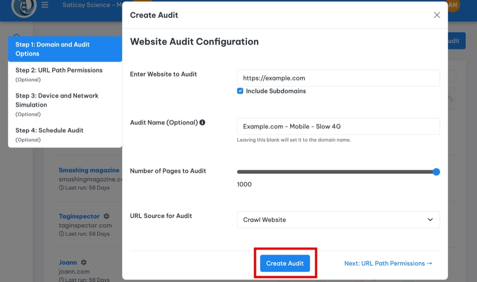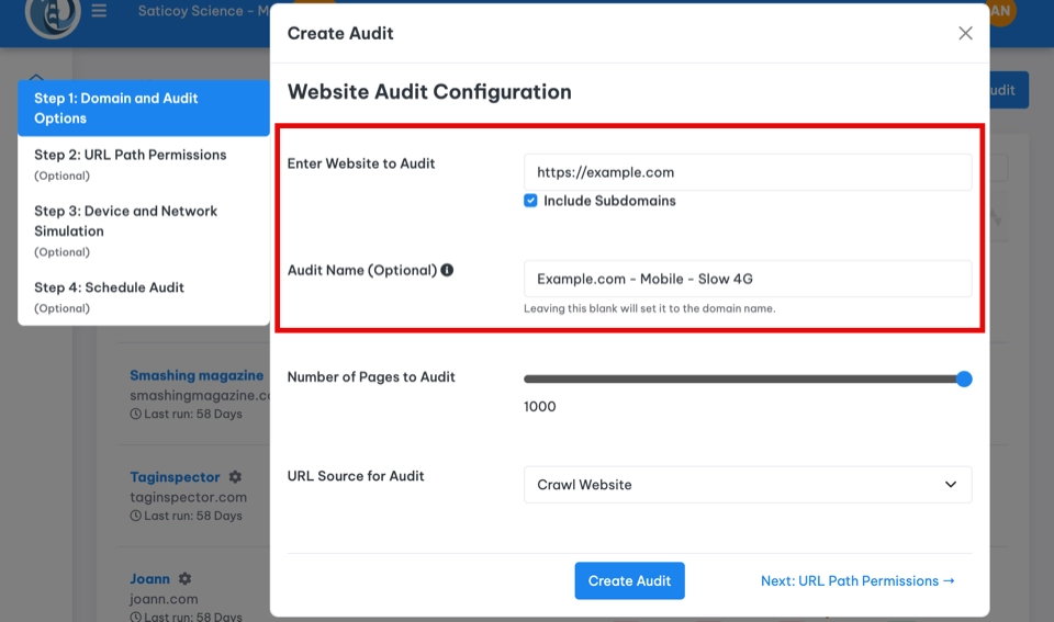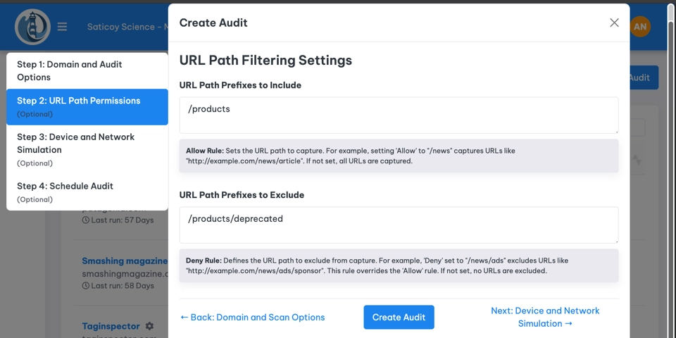 You can fine-tune your audit by specifying which URL paths to include. This is helpful if you want to focus on a particular section of your website, like your blog or product pages.