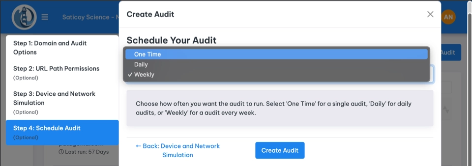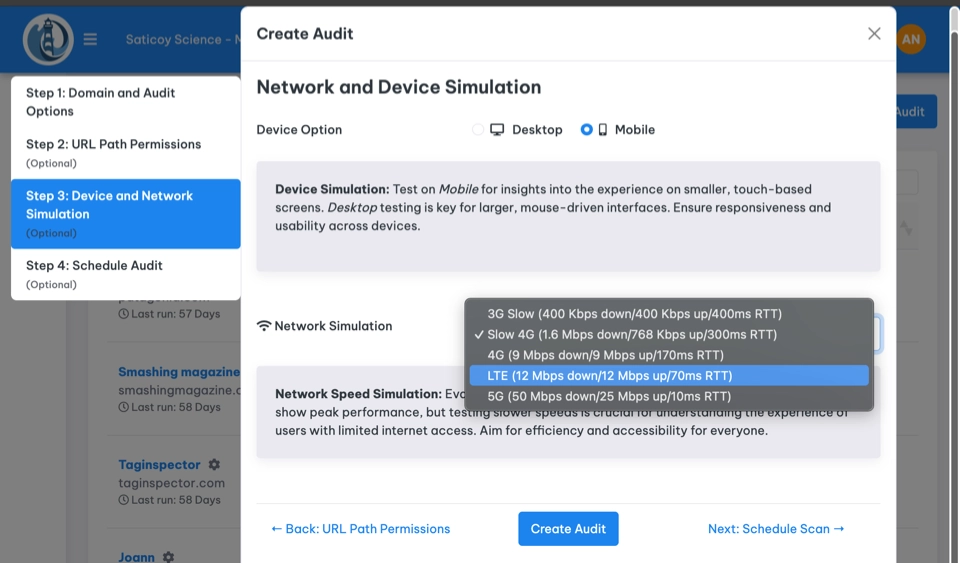 - Set an Audit Name (Optional): By default, the audit name will be your domain. However, you might want to customize this if you're testing various scenarios, such as mobile vs. desktop performance, different network speeds, or specific user flows. For example, you could name an audit "Mobile - Slow 4G" or "Desktop - Homepage Only."