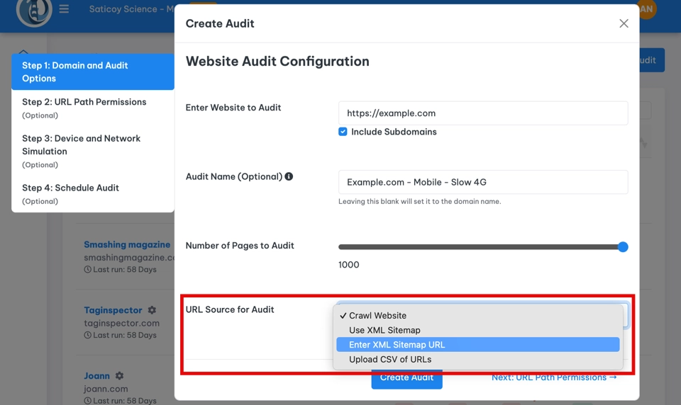 Lighthousebeyond offers several ways to select the URLs for your audit: